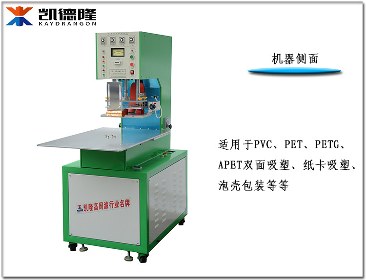 设备说明:1、采用真空电子管,输出功率稳定可靠。2、高灵敏火花过流保护回路。可有效切断因大电流输出损坏主机、压制火花。3、设有高周波频率稳定器及高周波装置,将高频干扰降低。4、无级调节机头行程,特殊机械踏板机构压力可达400KGS。5、可根据加工需要,选择气动加压方式,降低工作强度,提升电压产品之品质。6、无级调温加热系统,让工作效率高。7、四角式水平调节、调模简便省时。8、自动过流保护系统,增加真空电子管使用寿命,保护模具。9、4kw40.68MHz。5—12kw27.12MHz国际标准工业波段。
