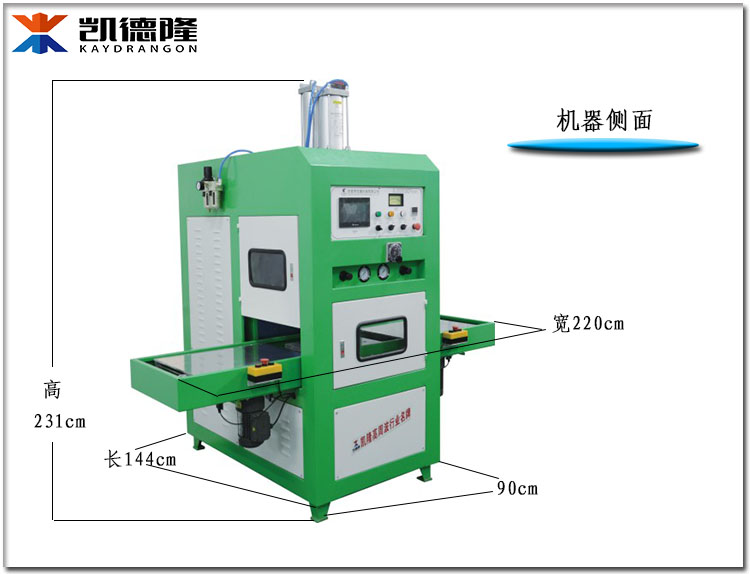 高周波熔断机特点:(1)功率范围5~35KW,压力40吨油压;(2)工作面积可达800×1000;(3)采用自动滑台装置,滑台动作快捷定位准;(4)熔断切边圆滑、手感极佳;(5)5557PL美式灵敏火花防护装置;