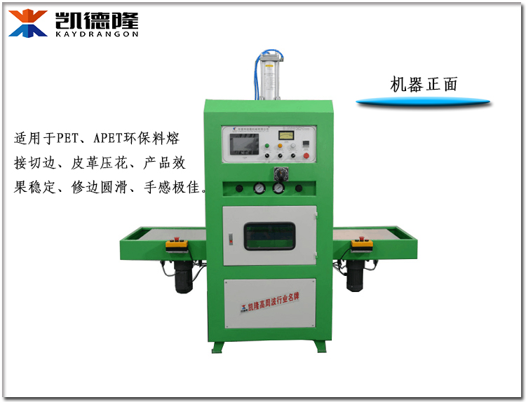 设备用 途:同时熔断充气靠枕、足球压花、纸板及吸塑(牙刷包装)同时熔断汽车合成皮椅,气垫粉扑、遮阳板,门板扶手等鞋类配件、商标、手表带、皮带、CD袋等。 APET、PTE、PTEG环保料双面吸塑泡壳包装 APET、PEG、PE、PP环保料折盒压线切边牙刷/牙线、吸塑吊卡包装,纸卡吸塑同步熔断合成布料皮革压花切边各种高周波材料熔接及熔断。