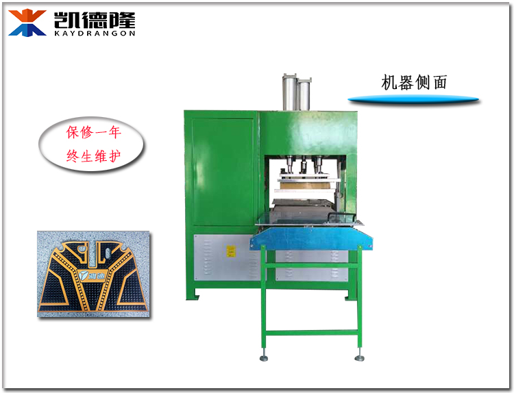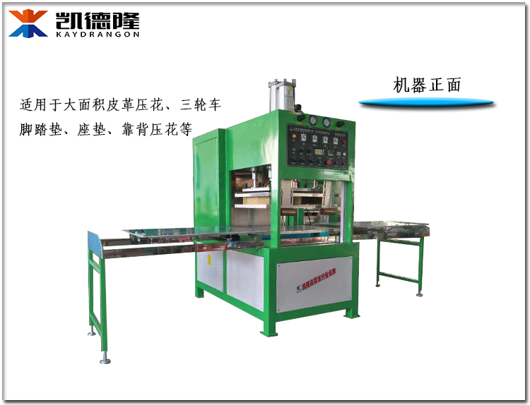 高周波电动车脚垫压花机设备说明:1、周率稳定;采用国际工业波段27.12MHZ,输出周率稳定,符合国际工业波段标准。2、输出力强:低损耗同轴振荡器,同调调谐器,输出力强缩短熔接时间,提高产量。3、安全性能;无论是突然遇到停电还是停气时,机器都是静止状态,不会突然上升或下降;提高工人操作安全问题。4、高速同调器;依产品的大小和物料厚度调节,能大大地降低必要之熔接时间,提高机器之生产量。5、防干扰装置;配置有频率稳定器及高频磁场屏蔽系统装置,将高频干扰降到低。6、加固式机架;平稳耐用。7、加热功能;适用不同产品加工需要。8、进口配件;重要的配件均适用日本、俄罗斯、美国以及台湾的正品电子原件。9、左右推盘操作;适用于较大尺寸的塑料(塑胶)产品热合焊接或者封口。